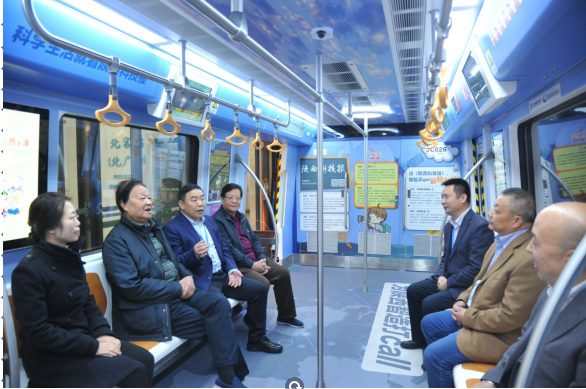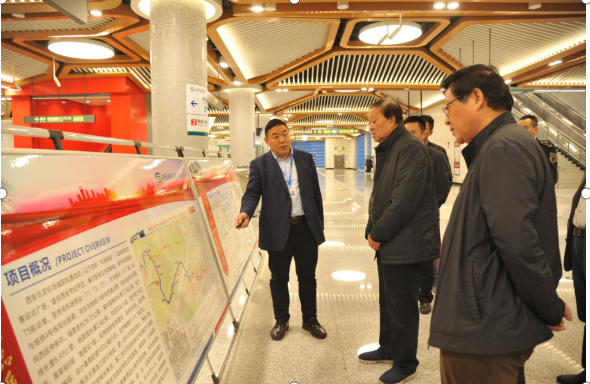 崔林涛一行乘坐机场城际“科学号”主题列车,调研沿线配套设施、景观建设,并详细参观主题列车内饰情况。在机场城际北客站(北广场)站、机场西站详细了解了项目建设历程、开通后首月运营情况及机场城际与西安咸阳国际机场、高铁北客站及地铁的换乘关系。在正线调研结束后,崔林涛等人前往机场城际车辆段参观,了解列车存放、维修运营内容及库房物资筹备情况。调研组对机场城际线路安全稳定运营给予了高度评价。