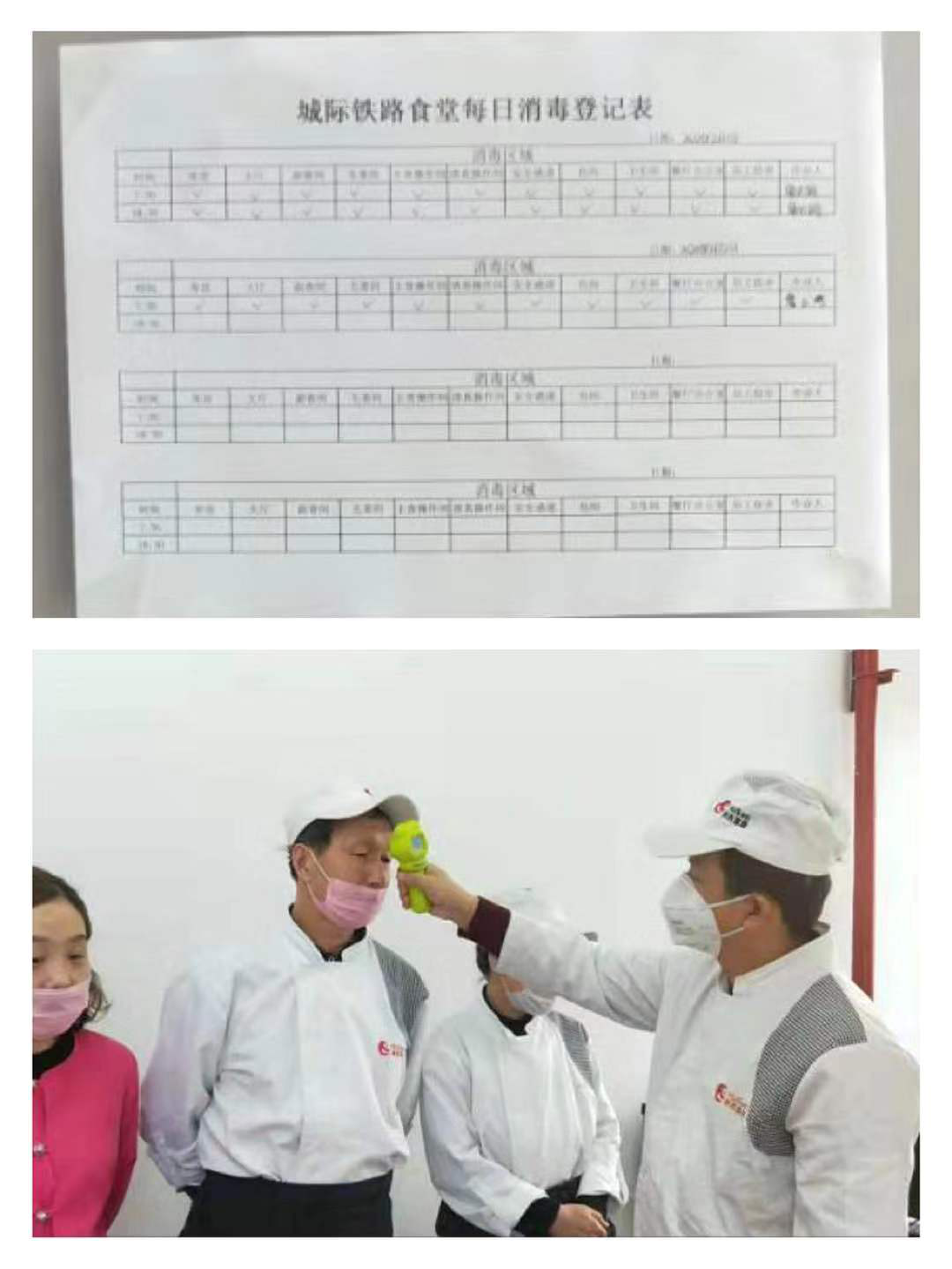 食堂对员工进行体温监测,并严格把控工作人员健康情况,公示各类消毒工作表及人员体温检测表。