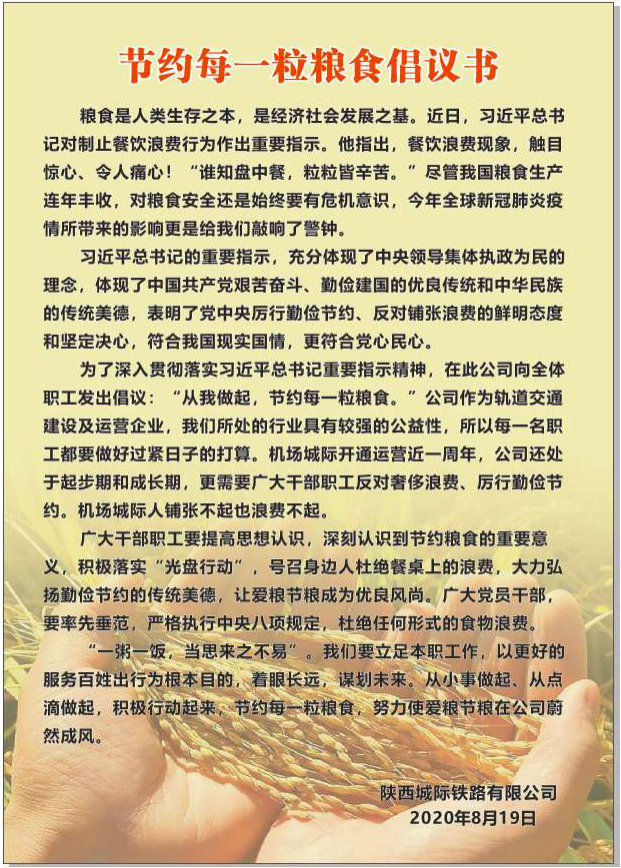 为积极践行习近平总书记对制止餐饮浪费行为的重要指示精神,进一步加强宣传教育,培养节约习惯,推动“浪费可耻、节约为荣”成为社会新风尚。城际铁路公司全面开展“光盘行动”活动。自活动开展以来,先后通过在职工食堂贴海报、拉横幅,在餐桌摆放宣传桌牌并向广大干部职工发出《节约每一粒粮食》的倡议书等形式进行广泛宣传教育。