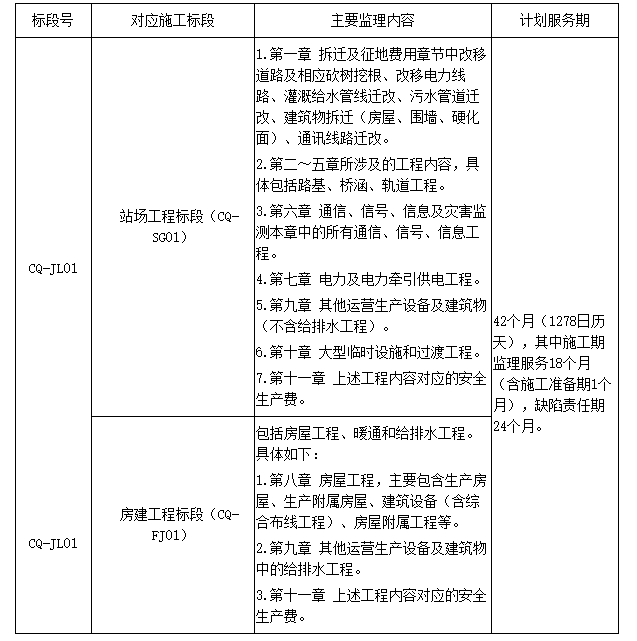 本项目设一个标段(CQ-JL01标段),具体如下: