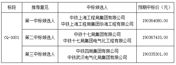 凤翔长青铁路专用线新建凤翔Ⅲ场站场工程施工总价承包在国内进行公开招标。项目法人凤翔长青铁路有限公司组织完成了评标工作,现将中标候选人单位公示如下: