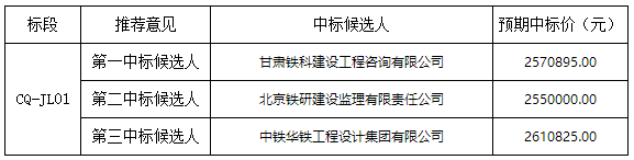 凤翔长青铁路专用线新建凤翔Ⅲ场施工监理在国内进行公开招标。项目法人凤翔长青铁路有限公司组织完成了评标工作,现将中标候选人单位公示如下: