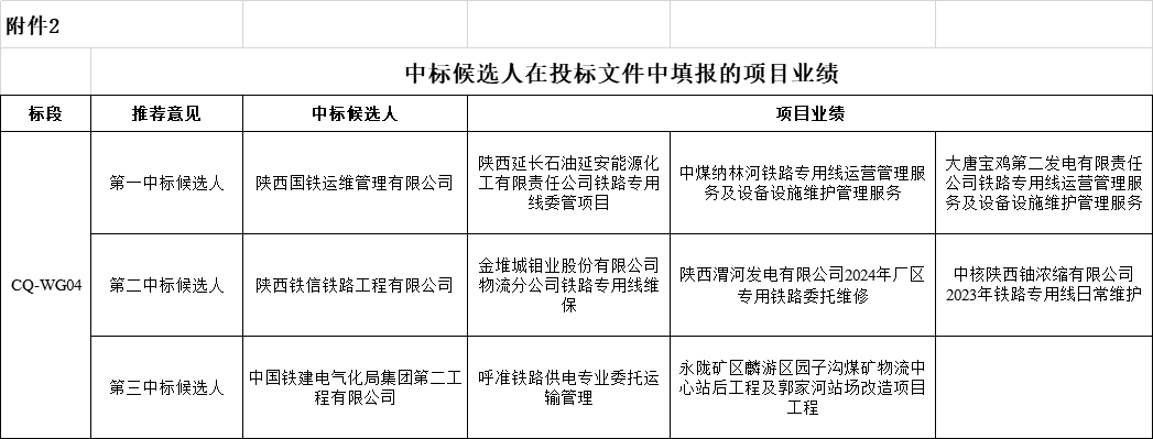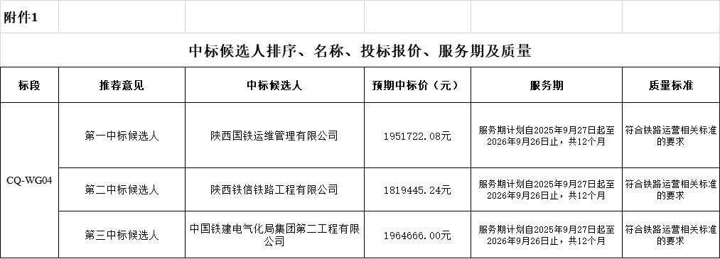 凤翔长青铁路专用线凤翔Ⅲ场与国铁接轨段铁路基础设施维管及部分运输服务在国内进行公开招标。项目法人凤翔长青铁路有限公司组织完成了评标工作,现将中标候选人公示如下: