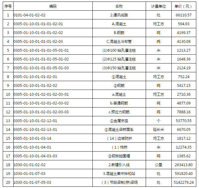 五、本次招标参与不平衡报价评审的20个清单子目如下表: