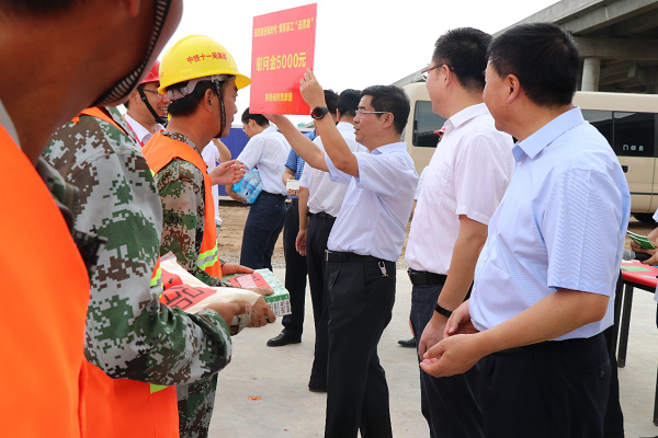 7月31日,省铁路集团总经理赵军锋在副总经理王建强、工会主席刘怀亮、党委委员徐西久的陪同下,来到西韩城际铁路控制性工程渭蒲特大桥施工现场,开展“砥砺奋进新时代 情系职工送清凉”活动,慰问高温下坚守岗位的一线参建人员。